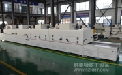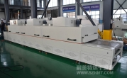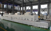 2、外形尺寸(約):總長8000*高1600*寬1200mm,進料部分長1000mm,加熱部分長6000mm(分3段溫區(qū)),收料部分長1000mm。輸送帶離地高700mm;